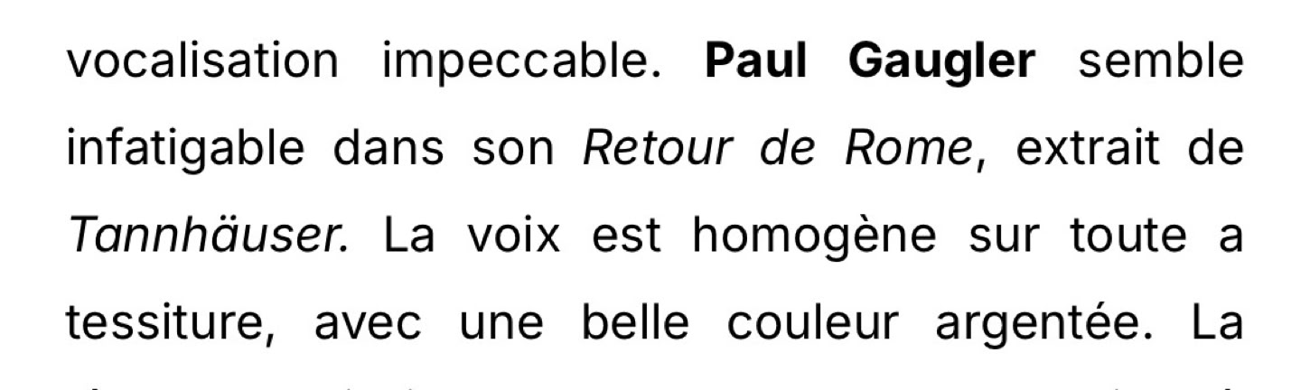 « On remarque particulièrement Paul Gaugler, qui apporte à Hoffmann son autorité et son engagement dramatique, avec une voix corsée et percutante »